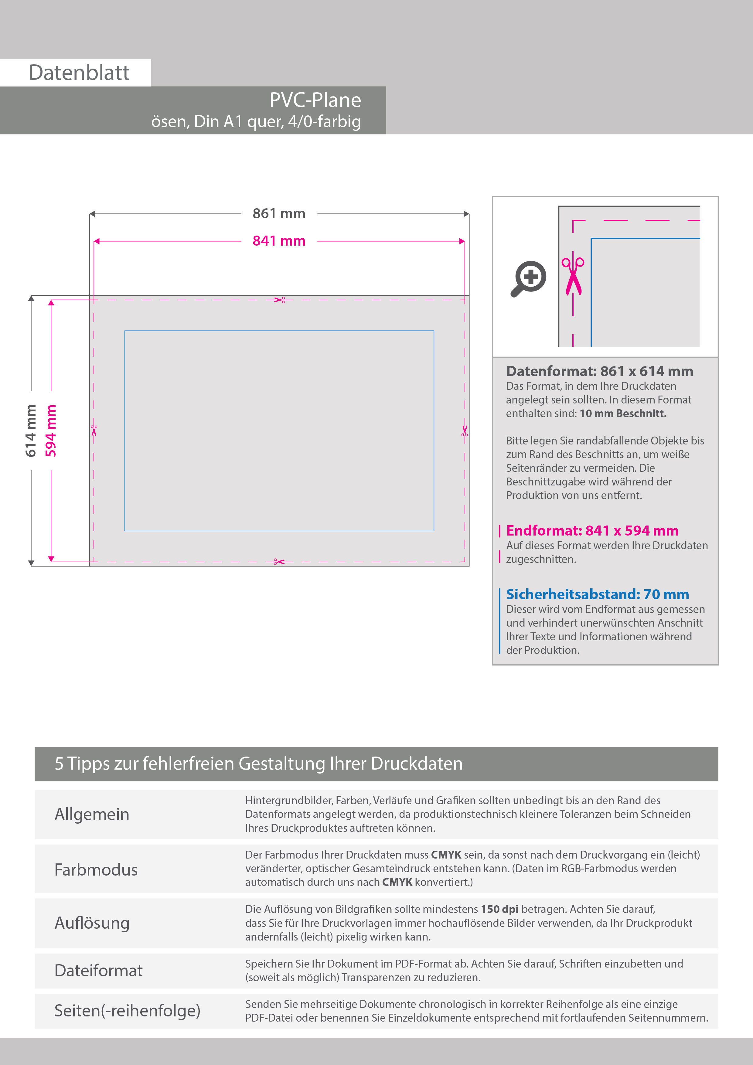 Hochwertige PVC-Plane DIN A1 quer (84,1 x 59,4 cm), 4/0-farbig bedruckt, Ösen im Abstand von 50 cm oben und unten