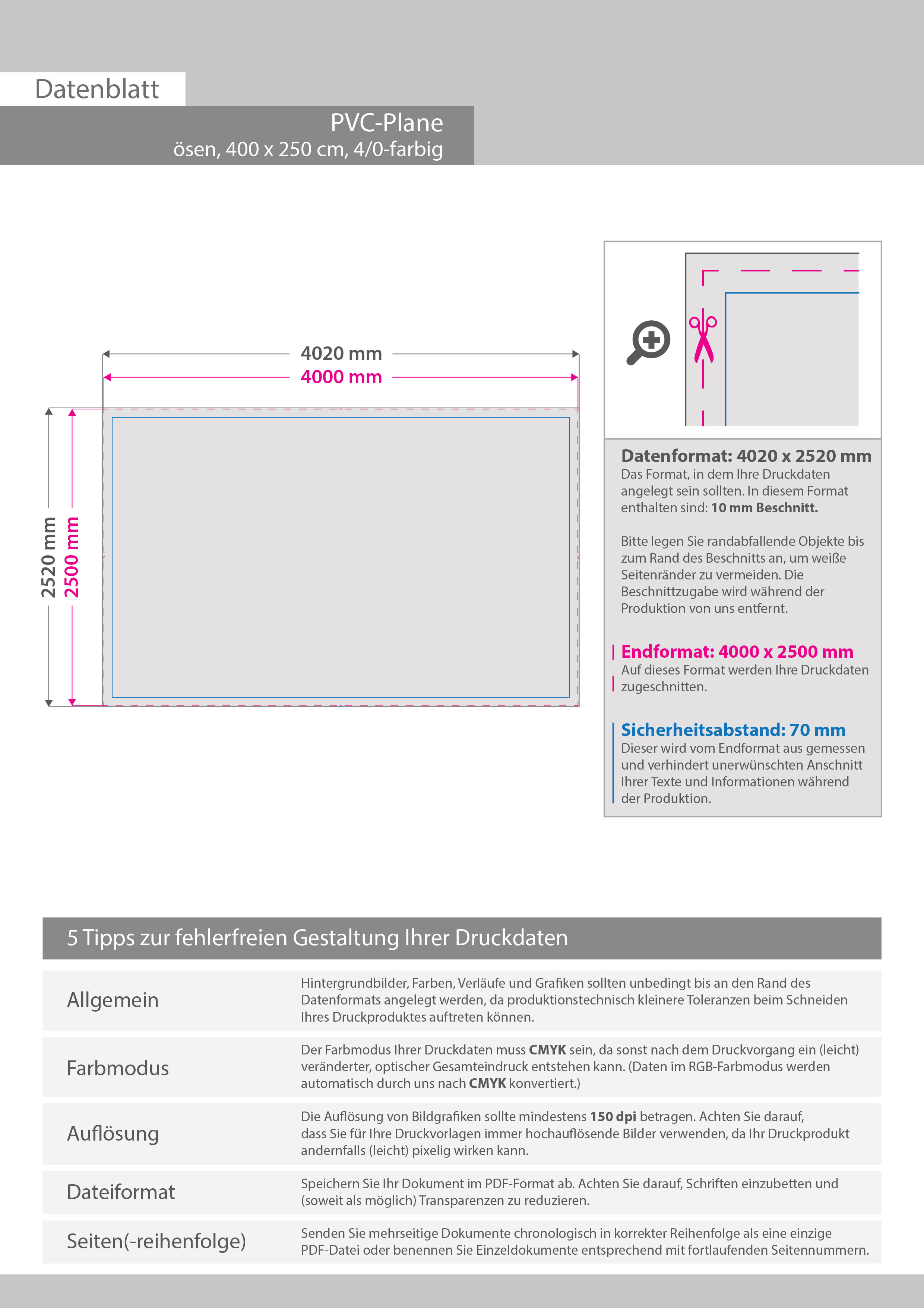 Hochwertige PVC-Plane 400 x 250 cm, 4/0-farbig bedruckt, Ösen im Abstand von 50 cm oben und unten