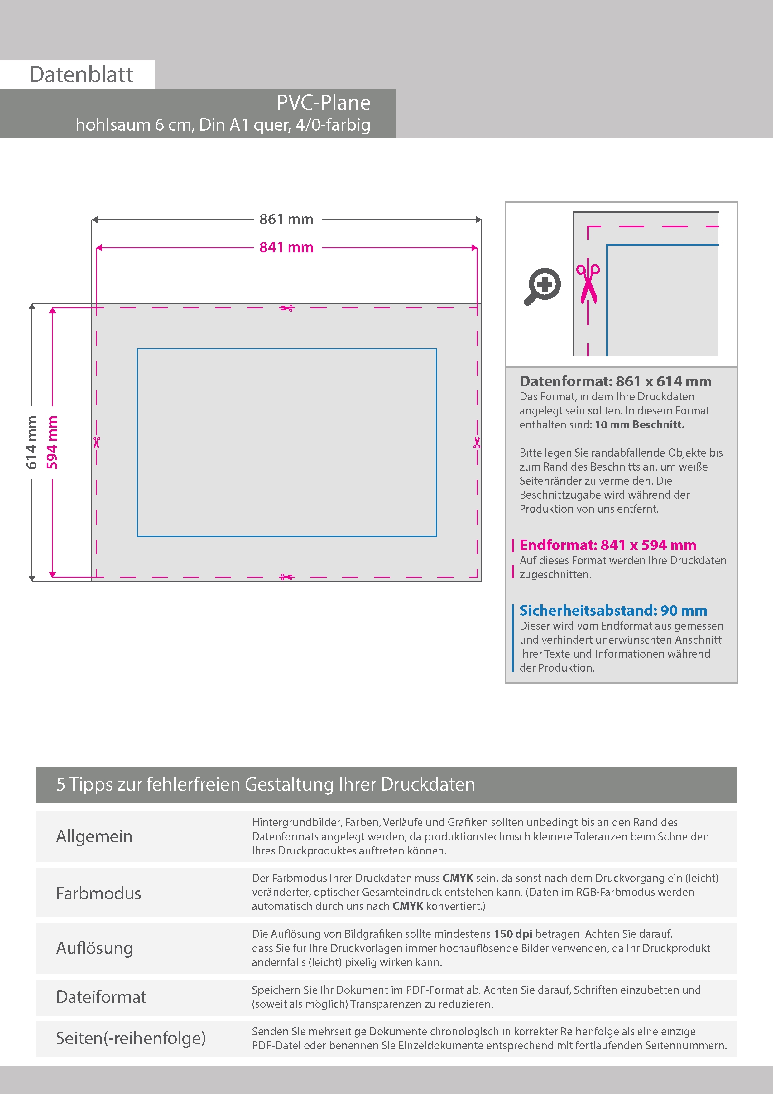 Hochwertige PVC-Plane DIN A1 quer (84,1 x 59,4 cm), 4/0-farbig bedruckt, Hohlsaum links und rechts (Durchmesser Hohlsaum 6,0 cm)