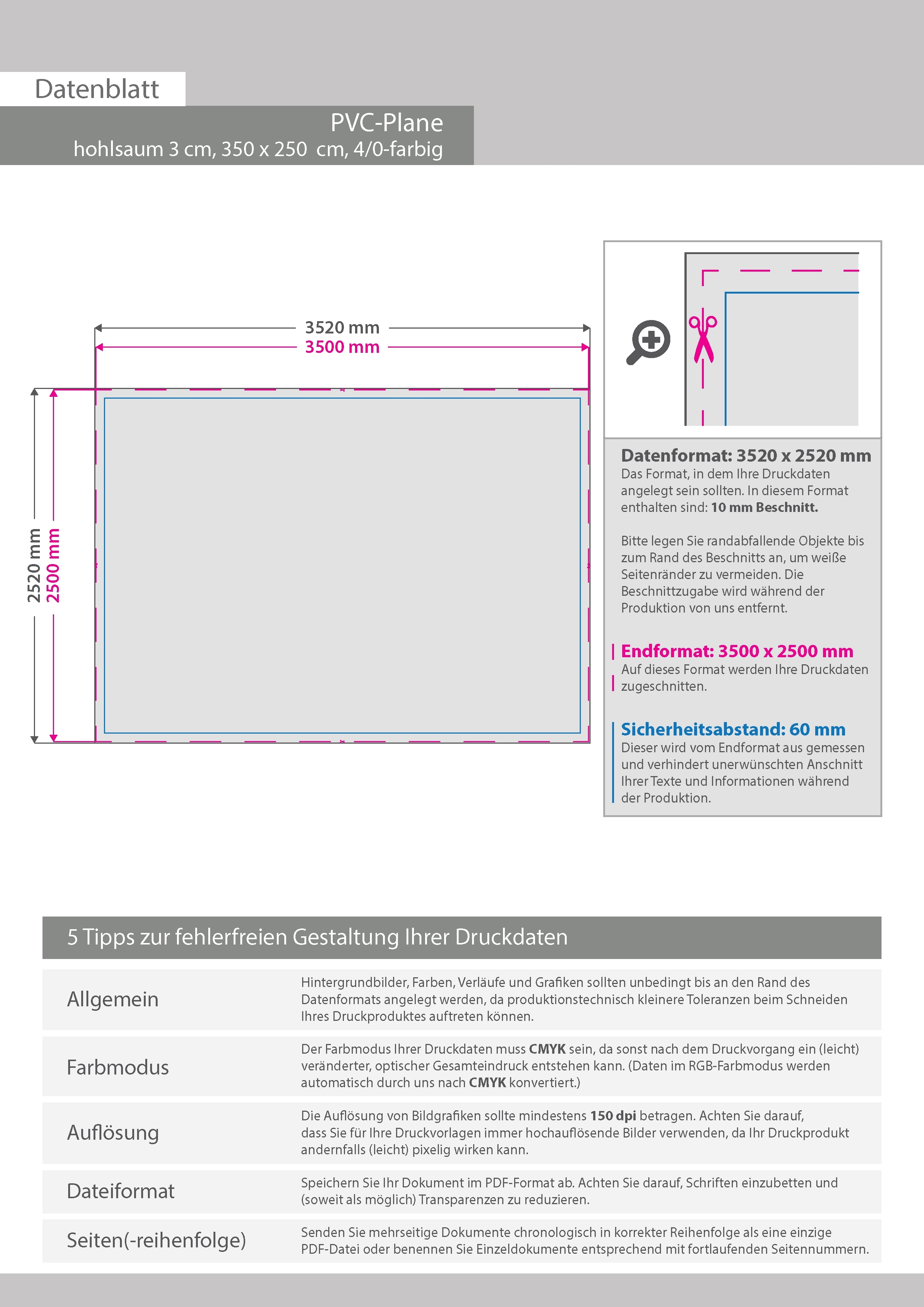 Hochwertige PVC-Plane 350 x 250 cm, 4/0-farbig bedruckt, Hohlsaum oben und unten (Durchmesser Hohlsaum 3,0 cm)