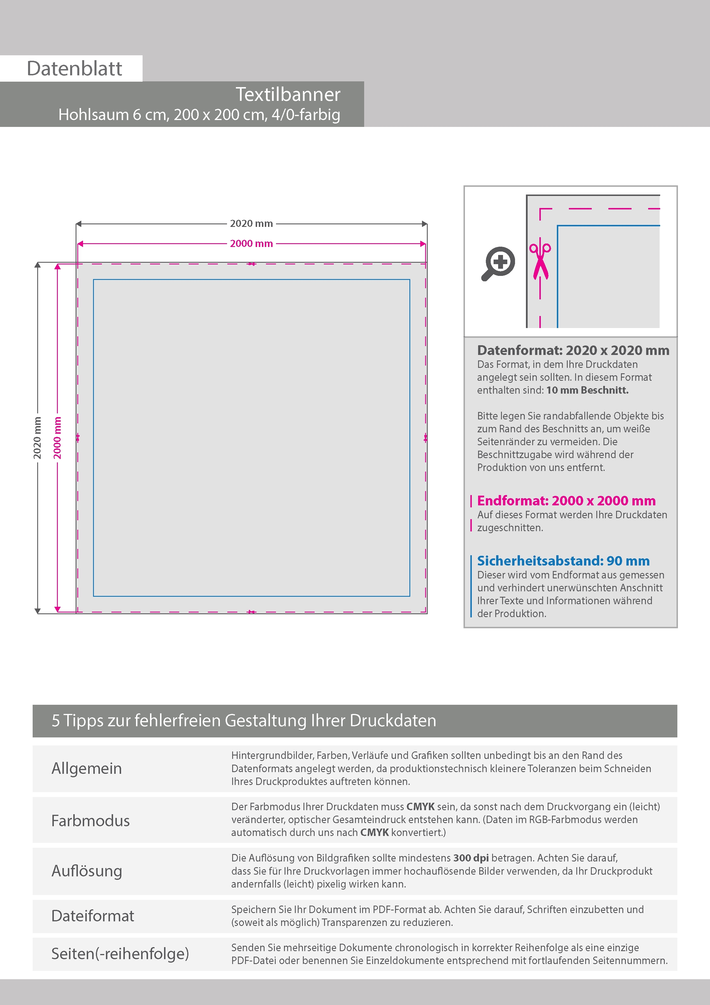 Hochwertige Stoff-Banner 200 x 200 cm, 4/0-farbig bedruckt, Hohlsaum oben und unten (Durchmesser Hohlsaum 6,0 cm)